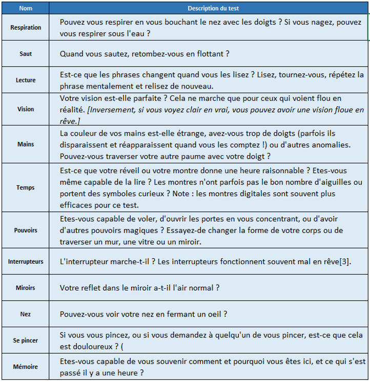 Il existe une multitude d'autres tests que vous pouvez trouver sur le net. J'ai décidé de me focaliser sur les plus fiables et les plus discrets. Il est inutile de vous présenter un test où le but serait de vous jeter par terre pour voir si vous arrivez à voler. Mais puisque vous êtes des petits rêveurs insatiables, je vous propose un petit tableau des tests de réalité les plus utilisés.
